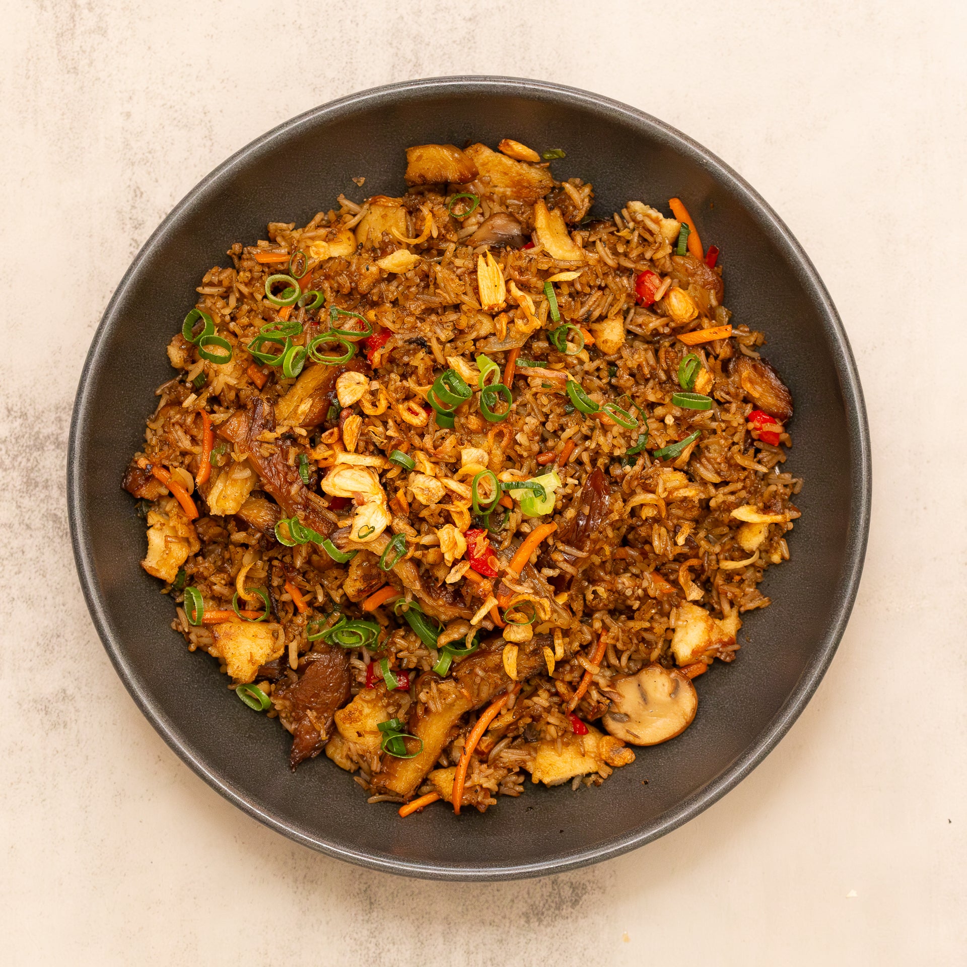 A bold Indo-style fried rice with that signature smoky wok aroma — loaded with plant-based duck and juicy chickenless pieces. Big flavour, zero effort.